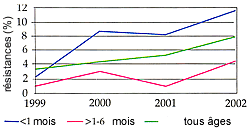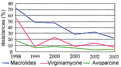 | Danemark: évolution de la résistance d'E. faecium à différents facteurs de croissance après leur interdiction en 1998 |