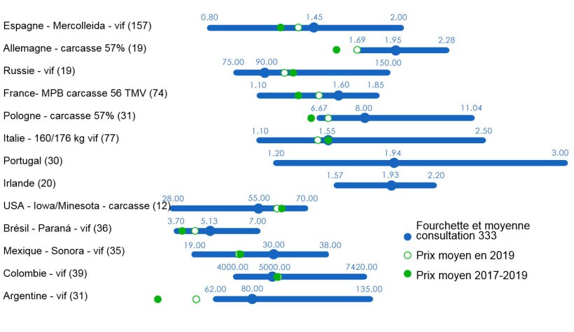Figure 1. Consultation 333 sur le prix moyen du porc en 2020. Fourchette et médiane des réponses obtenues par pays, prix moyen enregistré en 2019 et au cours des 3 dernières années. Entre parenthèses, le nombre de données analysées.