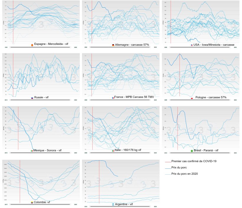 Figure 2. Évolution annuelle du prix du porc par pays (bleu), la ligne épaisse correspond au prix 2020. La date à laquelle le premier cas confirmé de COVID-19 est enregistré est indiquée en rouge.