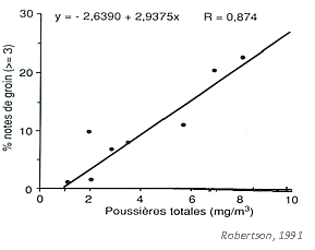 | Figure 2 : Relation entre charge en poussières de l’air inspiré et taux de nez atteints de Rhinite Atrophique (note ≥ 3). Noter la relation linéaire et le taux de corrélation élevé (r=0.874). | ![]() |