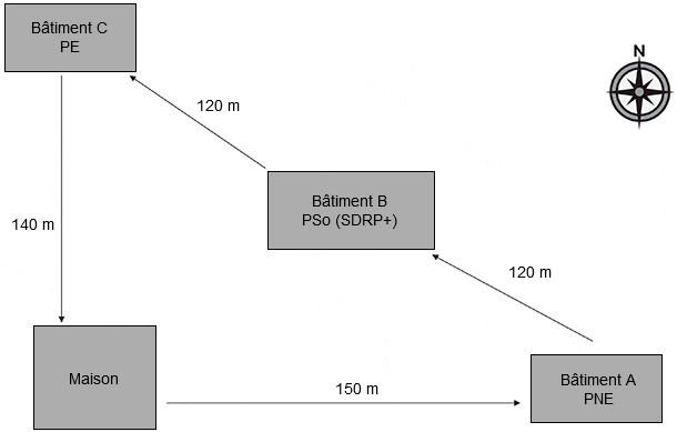 Bâtiment A PNE (population non exposée): ce bâtiment a été utilisé pour valider l'absence du transport et de la transmission du virus du SDRP par les vecteurs passifs et le personnel en n' ayant pas de contact antérieur avec le virus avant l'entrée.