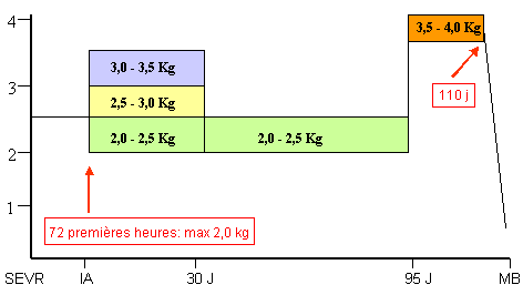 La croissance fœtale s'accélère dans les 20 derniers jours de gestation et c'est durant cette phase que l'alimentation doit être proportionnelle à l'augmentation du poids des fœtus. Sur le graphique ci-dessous, les concepts cités précédemment sont synthétisés, en précisant aussi les quantités d'aliment qui devront être fournies lors des différentes phases de la gestation.