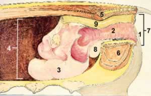| 1. Vulve 2. Vagin-col 3. Corne utérine 4. Cavité abdominale 5. Ischion 6. Pubis 7. Region perinéale 8. Vessie 9. Intestin |