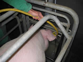| Malgré la présence d'abreuvoirs dans les cases de maternité, on peut conseiller d'administrer quelques litres (5 - 10) supplémentaires d'eau, environ 20 minutes après le repas ; il en est de même dans les jours précédant la mise-bas. |
