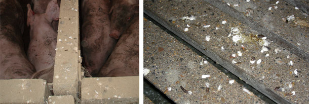 Image 3. A gauche : murs avec une abondance de fientes d'oiseaux, évidence nette de l'entrée constante d'oiseaux dans le bâtiment. A droite : détail du sol de l'engraissement contaminé avec des fientes d'oiseaux sauvages après son nettoyage et désinfection.