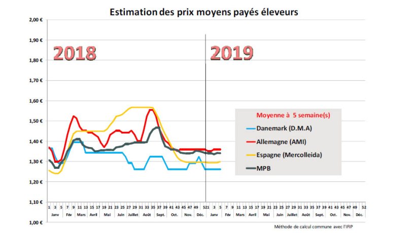 La première séance de marché hebdomadaire avait laissé espérer un début d’embellie sur le marché du porc avec une troisième hausse successive (pour un total de 1,1 cent), mais la séance de jeudi a douché tous les espoirs puisque le cours s’est replié de 6 millièmes et s’établit en fin de mois à 1,170 euro. Au fil du mois, entre gain et perte de millièmes, le cours est resté stable et la moyenne mensuelle est de 1,170 euro, en hausse de 4,84 % comparé à janvier 2018. Les allers retours de la cotation au MPB traduisent l’opposition entre un marché intérieur tiré par la grande distribution et un commerce à l’export rendu beaucoup plus difficile par l’importance des volumes actuels sur un marché de la viande européen très concurrencé. L’activité sur la zone Uniporc Ouest de cette 5ème semaine 2019 s’élève à 384 069 porcs (supérieure à la précédente de 2700 porcs). Malgré ce rythme d’abattage, les poids sont restés stables à 96,77 kg et se situent 620 g au-dessus des poids de la même semaine 2018, preuve que le retour à la fluidité est loin d’être atteint pour de nombreux élevages. Sur les 5 semaines de janvier, sur des bases comparables, l’activité d’Uniporc Ouest est en baisse de près de 1%, confirmant son repli entamé dans la seconde moitié de 2018.