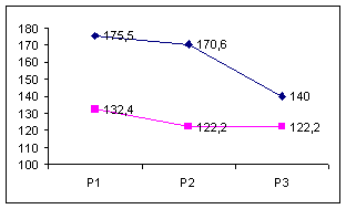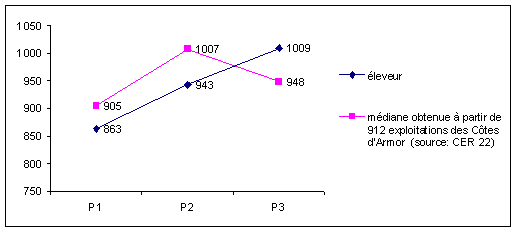 Le nombre de porcs vendus par truie par an passe de 20,70 sur la période 1 à 23,03 sur la période 3, soit un gain de 2.33 porcs vendus/truie/an ce qui représente environ 177 €/truie/an (source : écarts de marge calculés à partir des résultats GTE NE – Bretagne 2006). Il faut également noter que le poids des charcutiers a fortement augmenté entre P1 (84.06 kg) et P3 (86.77 kg) pour un même âge à la vente. L'indice de consommation économique a d'autre part diminué sur la dernière période (- 0,11) de manière plus importante que pour le groupe de référence. Enfin, les frais vétérinaires, qui restent élevés en raison des coûts de vaccination, ont tendance à diminuer et se rapprochent de la médiane. |