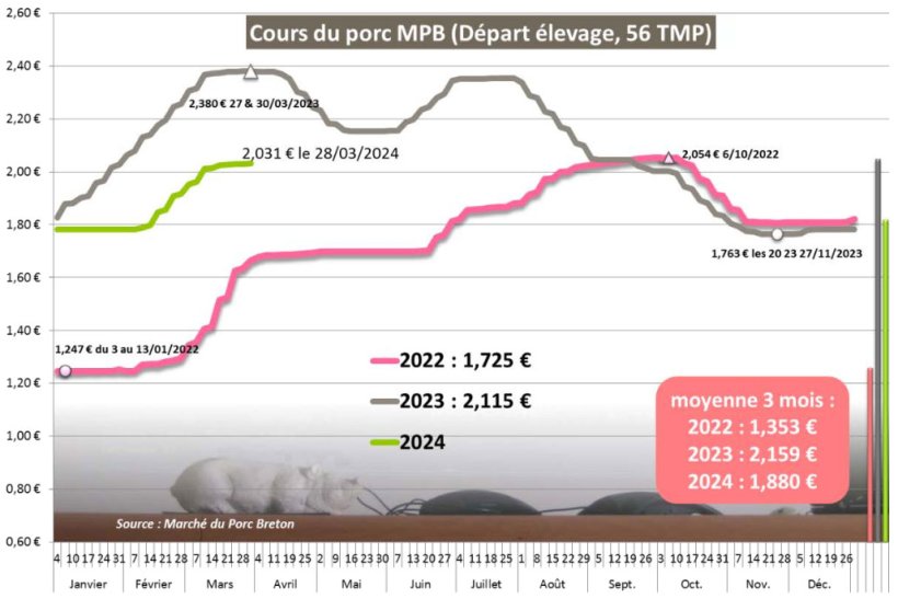 Au Marché du Porc Breton, le prix du porc a progressé plus lentement qu’en février pour se stabiliser complètement la dernière semaine du mois. La hausse totale est de 7,7 centimes pour un cours qui s’établit en fin de mois à 2,031 euros dans un contexte de marché plus équilibré entre des offres peu élevées et une demande sans élan particulier, même à quelques jours des fêtes de Pâques, placées assez tôt cette année sur le calendrier. Les abattages de ce premier trimestre 2024 sur la zone Uniporc affichent une certaine stabilité depuis le début de l’année (sur des bases comparables), les poids sont en moyenne supérieurs de 1 kilo aux poids de 2023 sur la même période.