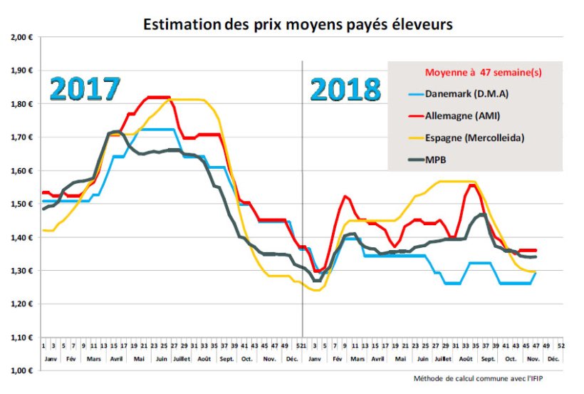 La seconde séance de vente hebdomadaire a confirmé la stabilisation du cours à 1,171 euro (+0,1 cent). La présence de nombreux lots sans enchère démontre toutefois que l’approvisionnement des abattoirs reste encore aisé. Des amplitudes de prix plus étroites traduisent une plus grande homogénéité dans les achats. A 1,171 euro, le prix « spot » 2018 est proche de celui de 2017 (1,179 euro) ; en moyenne annuelle, l’écart reste important puisqu’il frôle les 20 cents de différence (-14%), accentuant fortement le ciseau prix payé / coût de revient et mettant à mal les trésoreries de nombreux élevages. L’activité d’abattage sur la zone Uniporc Ouest de la semaine passée s’est élevée à 377 345 porcs (- 4200 porcs / semaine 46). A noter que l’activité de cette semaine 47-2018 est en baisse de 2,5 % par rapport à la même semaine 2017 tandis que les poids de la semaine 47 sont 150 g inférieurs à la même référence 2017. Les différents blocages sur les routes depuis le début de la semaine ont pu perturber la logistique dans l’acheminement des porcs vers les abattoirs et accentuer certains retards accumulés depuis le férié du 1er novembre. Toutefois, les poids augmentent peu à 95,7 kilos (+100g), moyenne entre des porcs plus légers à la suite d’anticipations d’annonces et de porcs plus lourds issus de retard d’enlèvement.