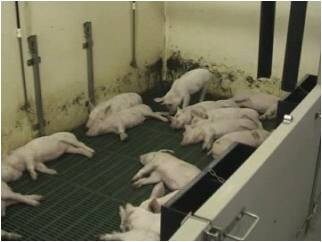 L'espace dans la case est aussi essentiel ; un porc de 80 kg couché latéralement occupe un espace d'environ un mètre carré, alors que debout ou en décubitus sternal cet espace est de moins d'un demi-mètre carré. Cela veut dire que, sous des conditions de stress dû à la chaleur, rien que pour se coucher et perdre de la température, les animaux ont besoin de plus d'espace. C'est-à-dire, pour des animaux de 80kg, les 0,60 m2 exigés par la loi peuvent très bien marcher en hiver mais peuvent poser de sérieux problèmes de concurrence pour l'espace en été.