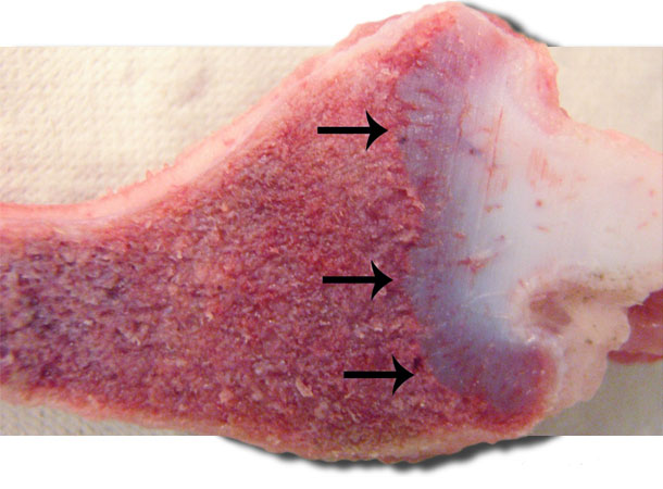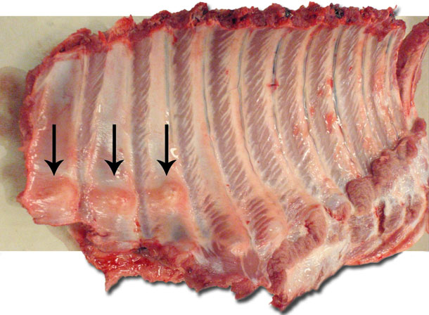 Dans les dernières années il semble qu’on ait aussi détecté des problèmes de déficit en vitamine D chez les porcs d'engraissement. Les porcs atteints ont une résistance osseuse réduite qui peut entraîner des boiteries, du rachitisme, avec des zones de croissance élargies (figure 1) et des fractures osseuses (figure 2); il peut aussi se produire des parésies hypocalcémiques et des tremblements. Dans quelques cas, le manque en vitamine D peut se manifester par des morts aigües inexpliquées. Dans beaucoup de cas cliniques on n'avait pas ajouté une vitamine D à la ration ou elle s'était oxydée avant d'être ingérée par les porcs.