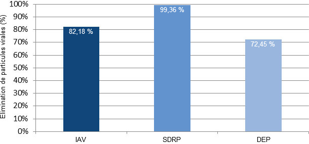 Graphique 1. Pourcentage de virus éliminés de l'air après traitement de l'aérosol généré par les animaux pendant un épisode aigu dû aux virus influenza (IAV), SDRP et DEP.