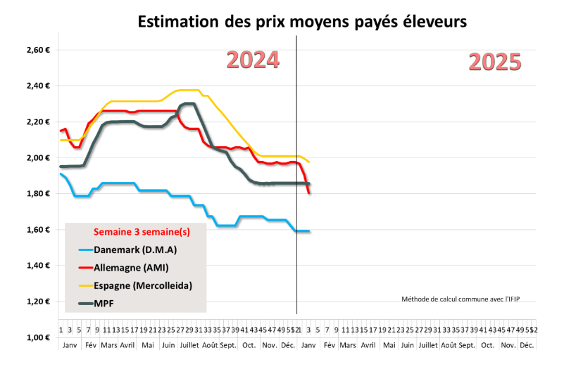 Le marché allemand est fortement déstabilisé depuis huit jours en raison de la détection de cas de fièvre aphteuse sur son territoire, entraînant une situation confuse. Plusieurs pays, dont le Royaume-Uni et la Corée du Sud, ont déjà suspendu leurs importations en provenance d'Allemagne. Si aucun nouveau cas n'est signalé, une stabilisation reste possible, mais toute nouvelle complication risquerait d’aggraver la crise. Une deuxième baisse consécutive a été enregistrée cette semaine, portant la perte à 20 centimes en quinze jours. Concernant l'activité d'abattage, les excédents de la période de festivités s'écoulent lentement, tandis que les poids moyens dépassent désormais les 100 kg.