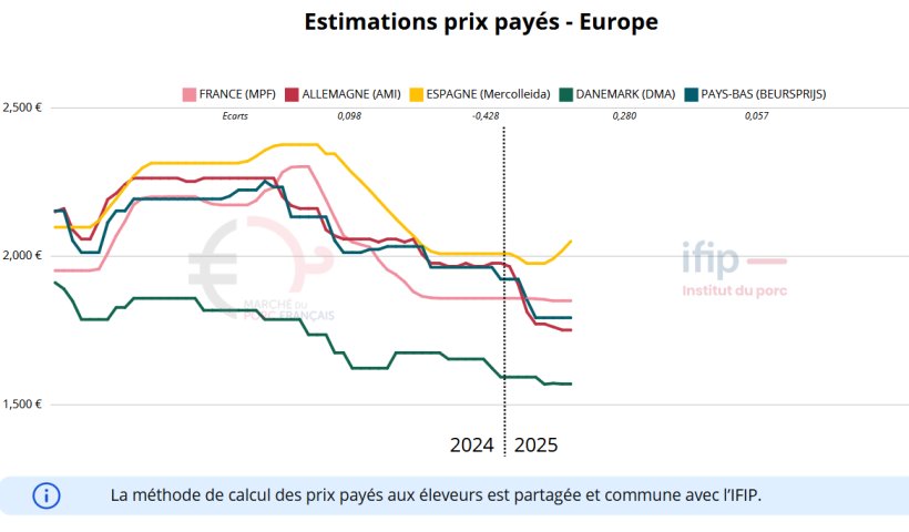 En Espagne, les abattoirs sont sous pression pour sécuriser les volumes de porcs, tandis que l'offre locale reste insuffisante, nécessitant toujours plus d'importations, y compris pour les porcelets. Malgré une bonne exportation des poitrines, les prix de la viande stagnent, ce qui pourrait compliquer la situation des abattoirs. Pour l’instant, leurs marges sont maintenues, mais elles pourraient se réduire dans les prochaines semaines. Malgré tout, le cours du marché du porc en Espagne continue de progresser confortablement.