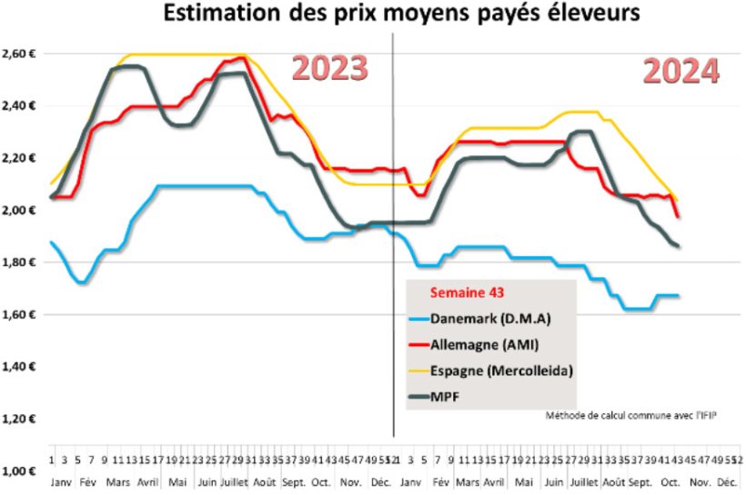 Les 2 séances de cette avant dernière semaine d’octobre précédant celle du férié du 1er novembre ont totalisé 1,4 centime de baisse portant ainsi le cours à 1,694 euro. C’est une semaine au MPF où diverses positions à l’achat se sont exprimées, entre reconduction du cours et baisse plus ou moins forte ce qui s’est traduit par un recul mesuré de la cotation à Plérin. Le nombre de porcs présentés le jeudi 24 octobre était adapté au ralentissement d’activité de cette semaine à jour férié, cela n’a pas empêché un nombre important de porcs sans enchères qui bénéficieront d’une journée supplémentaire pour être enlevés. L’activité de la semaine dernière sur la zone Uniporc a été l’une des plus importantes de cette année 2024 avec 362 277 porcs abattus. C’est la 5ième semaine consécutive d’abattages supérieurs aux mêmes semaines 2023 alors que jusqu’à présent la tendance était invariablement à la baisse. Les poids sont stables à 96,93 kg, résultat d’une bonne croissance dans les élevages. Cette nouvelle tendance des abattages laisse augurer d’une relative stabilité de la production 2024 d’autant plus que les poids moyens sont plus lourds qu’en 2023.