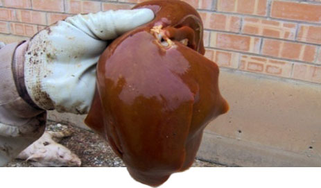 Les autopsies réalisées montraient une hémorragie gastrique aigüe avec une importante dilatation de l'estomac, un œdème mésentérique, des ulcères importants et, dans 80 % des cas, une hépatomégalie sévère, une coloration orangée et une constitution friable du foie.