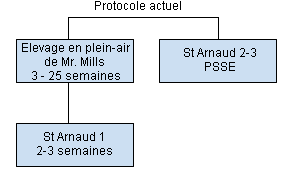 Les animaux destinés à être multiplicateurs dans le noyau final St Arnaud 2-3, étaient nés dans un noyau indépendant, nommé St Arnaud 1, à 20 kms de distance. Les deux exploitations avaient une grande expérience en qualité d'élevages de truies reproductrices. Avant cela, les porcelets de St Arnaud 1 ont été sevrés à 3 semaines et étaient transférés dans un nouvel élevage à 100 km, isolé et en plein-air, dirigé par un éleveur employé à temps partiel, Mr. Mills, jusqu'au moment de la sélection pour entrer dans le noyau multiplicateur à 25 semaines d'âge. Les porcs élevés dans l'élevage de Mr. Mills sont conduits dans un système tout plein tout-vide. Son exploitation n'avait jamais reçu de porcs auparavant.
