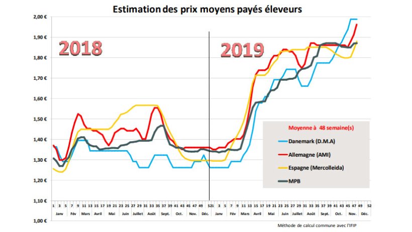Le marché français a fait exception à la règle en enregistrant une hausse minimale de 0,1 cent à 1,701 euro. Pourtant le contexte semblait favorable à une véritable hausse car l’activité affichée sur les trois premiers jours laissait apparaître un nouveau record d’abattage pour cette année 2019 accompagné pour la première fois depuis le mois d’août d’une baisse des poids moyens de l’ordre de 100 g. Encouragés par les tendances franchement haussières des principaux bassins européens, les vendeurs ont tenté de résister en refusant près de 4 900 porcs à la vente face à l’évidente volonté des abattoirs de reconduire le cours. Certains abattoirs ont invoqué la prochaine grève des services vétérinaires le 5 décembre prochain qui impactera leur activité, d’autres ont dû faire face à des pannes sur leur chaines d’abattage, entraînant des reports. La semaine s’est achevée sur une activité de 397 317 porcs, entérinant un nouveau record 2019. Les poids moyens s’établissent à 96,75 kilos en baisse de 82 g. Ce mois de novembre 2019 aura donc été marqué par une relative stabilité du cours, à un haut niveau certes, mais en marge toutefois d’une orientation européenne plutôt haussière. Le prix moyen de novembre s’établit à 1,690 € en hausse de 44,32 % ; depuis janvier, la progression du cours est de 23,64 % à 1,480 €. L’activité d’abattage sur la zone Uniporc Ouest du mois de novembre a enregistré des records et sans la présence du 11 novembre, férié un lundi contre un dimanche l’an passé, les abattages auraient été supérieurs de l’ordre de 3,4% de la semaine 45 à 48 par rapport à la même période 2018. Depuis le début de l’année (semaines 1 à 48) et sur des bases comparables, l’activité progresse de 0,74%.
