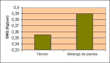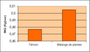 Fig. 1 et 2. Effet de l'utilisation d'un mélange de plantes sur le Gain Moyen Quotidien (GMQ) et sur l'Ingéré Moyen Quotidien (IMQ) chez des porcelets depuis le sevrage jusqu'à 25 jours post-sevrage.