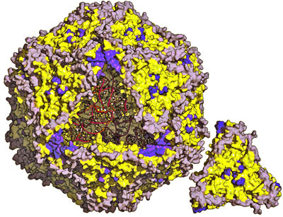 Structure du virus du PCV2 : Représentation de la surface de toute la capside du PCV2, projetée le long d'un triple axe icosaédrique. La coupe transversale triangulaire correspond à un capsomère trimérique de protéines de la couche (inférieur droit) pour illustrer le contexte biologique réel du virion Protein Data Bank ID: 3R0R.