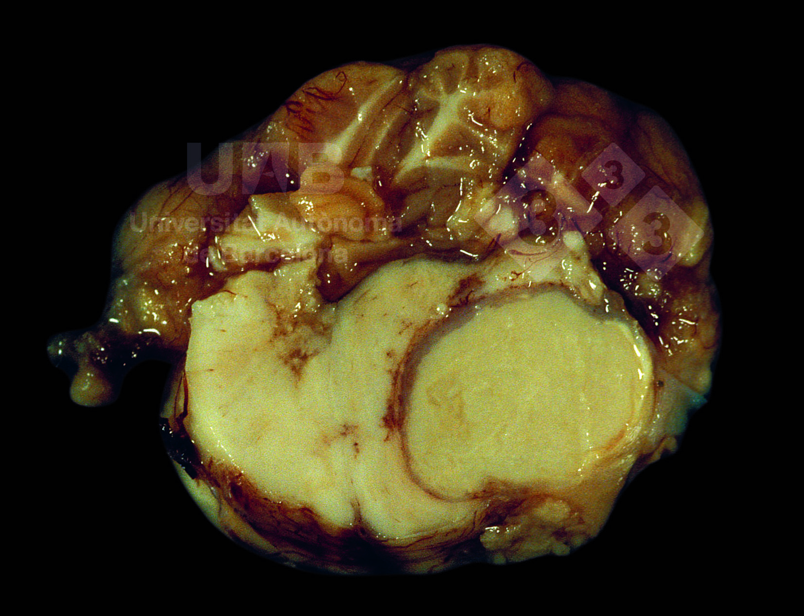 Cette lésion correspond à un abcès, foyer nodulaire de tissu nécrotique et purulent entouré par une capsule fibreuse. Les abcès, en tout lieu, sont causés par des infections bactériennes. L'abcès de la photo est sur le tronc cérébral, probablement en raison de la propagation de l'infection bactérienne d'une otite interne.