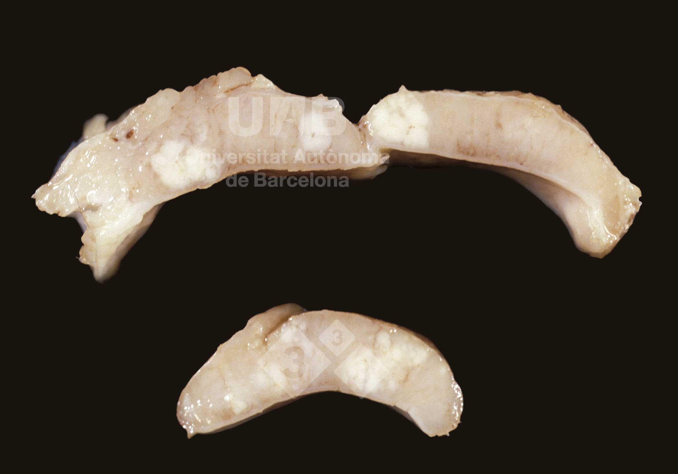 Les zones multifocales blanchâtres sur ces amygdales sont très évocatrices de nécrose. Cette lésion peut être produite par la maladie d'Aujeszky, la peste porcine classique ou la peste porcine africaine.
