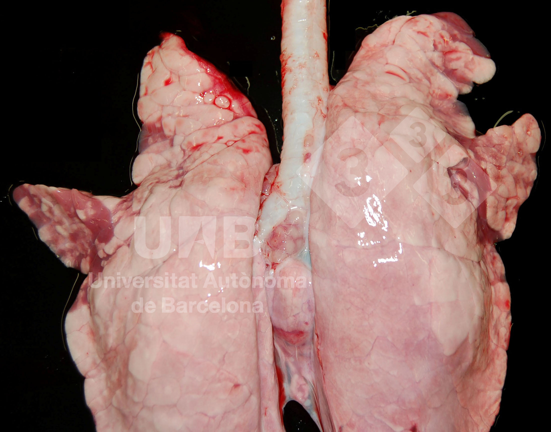 La distribution cranioventrale des surfaces rouges et collapsées du parenchyme pulmonaire (atélectasie) est très suggestive d’une infection par le virus de l’influenza porcin. Dans certains cas, les bronchopneumonies par bactéries secondaires peuvent occulter les lésions macroscopiques d’influenza. Le diagnostic différentiel de cette lésion est l’infection par Mycoplasma hyopneumoniae (pneumonie enzootique).