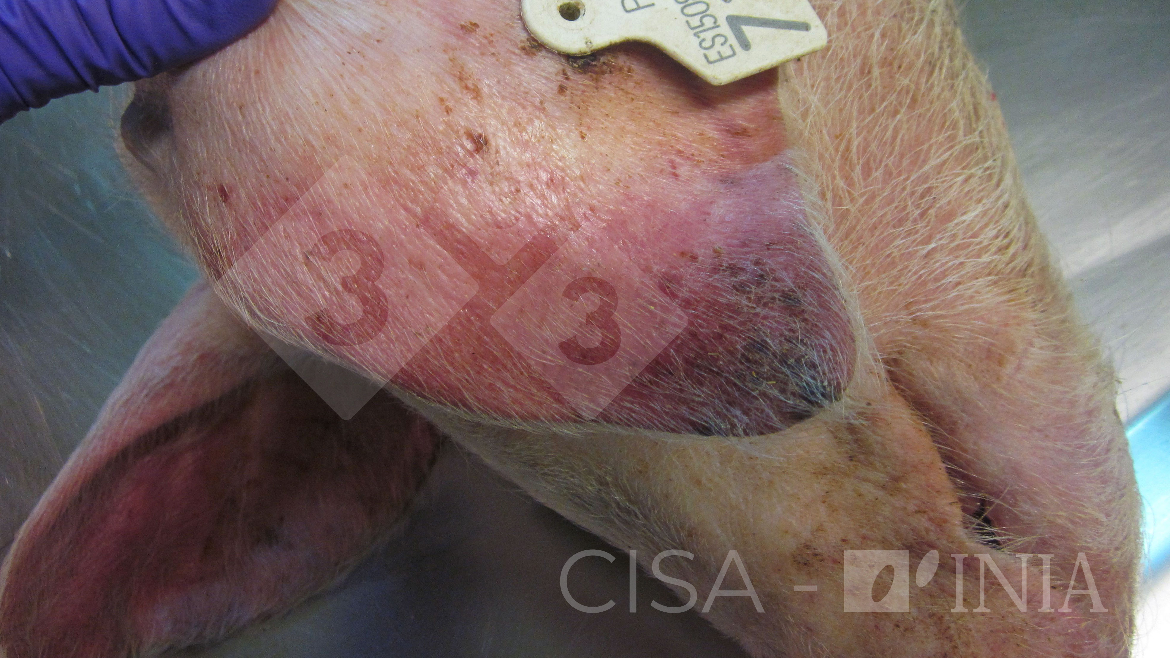 Lésions cyanotiques sur le bout des oreilles d'un animal atteint de peste porcine africaine. L'animal avait une forte fièvre et de l'apathie. Au début, les rougeurs sont dues à une hyperhémie qui évolue en cyanose. Les zones cyanotiques peuvent également apparaître sur d'autres parties du corps, telles que la queue, la partie distale des extrémités, la poitrine ou l'abdomen.