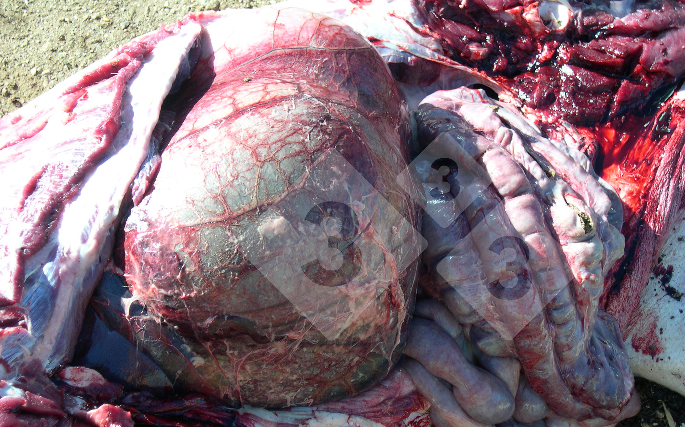 Cet estomac dilaté rempli de gaz sur une truie reproductrice est typique de dilatation gastrique. Les truies reproductrices atteintes sont souvent des animaux en bonne condition physique qui meurent subitement, avec un abdomen très distendu, comme un énorme ballon. Lorsque on ouvre soigneusement l'abdomen on trouve que la distension est due à une dilatation massive de l'estomac, rempli la plupart du temps avec un gaz avec une odeur particulière, mais aussi avec des aliments partiellement digérés et du liquide aqueux. Dans certains cas, l'estomac peut aussi présenter une torsion partielle, laissant la rate bien visible dans la partie supérieure de l'estomac. Les poumons sont très sombres et congestifs. Dans des conditions normales, l’aliment ne fermente pas dans l'estomac et tout gaz ingéré peut être régurgité. Cette dilatation gastrique dramatique peut se produire lors du passage à un régime alimentaire pauvre en fibres, en particulier chez les truies reproductrices qui sont nourries une fois par jour et ne font pas d’exercice. Dans ces cas, les truies peuvent ingérer beaucoup d’aliment en peu de temps, mélangés à de l'air, qui fermente dans l'estomac, en produisant une grande quantité de gaz. Cet excès de gaz ne peut être éliminé, produisant une grande dilatation de l'estomac qui augmente la pression sanguine dans les vaisseaux, les poumons et le cœur, provoquant une défaillance du flux sanguin et la mort.