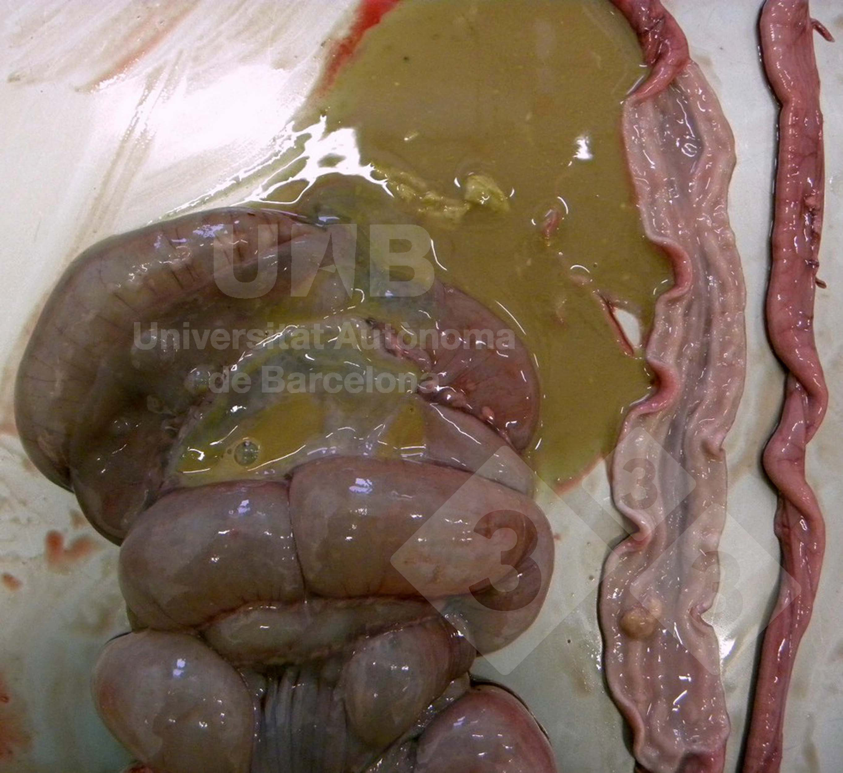 Cet animal a un contenu intestinal liquide avec des caillots de fibrine dans le colon (colite catarrhale fibrineuse). L’observation de fibrine dans le colon suggère une salmonellose.