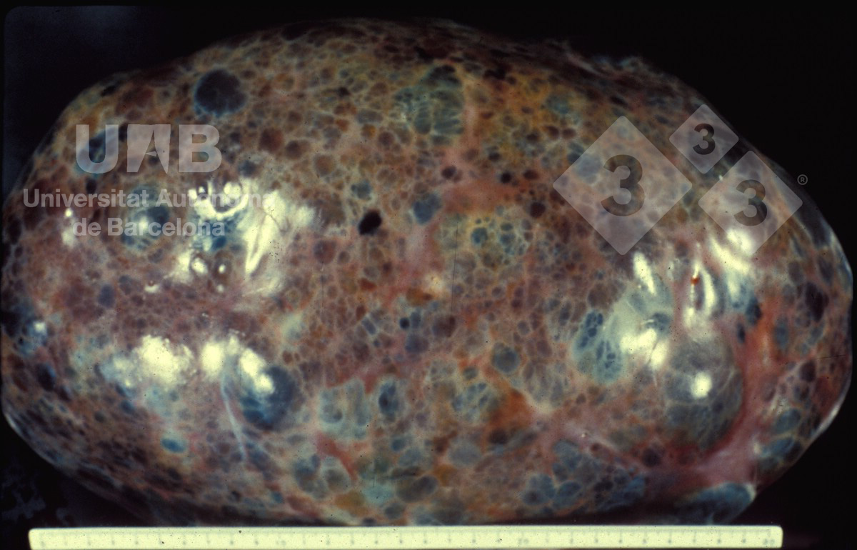 Ces lésions correspondent à des kystes intra-hépatiques congénitaux ont pense qu'elles proviennent des voies biliaires embryonnaires. Du point de vue de la santé publique, cette lésion doit être différenciée des kystes hydatiques causés par le cestode Echinococcus granulosus . Le kyste hydatique fertile a des "capsules filles" contenant des protoscolex et du «sable hydatique" dans son fluide, qui est constitué de capsules filles et de protoscolex filles.