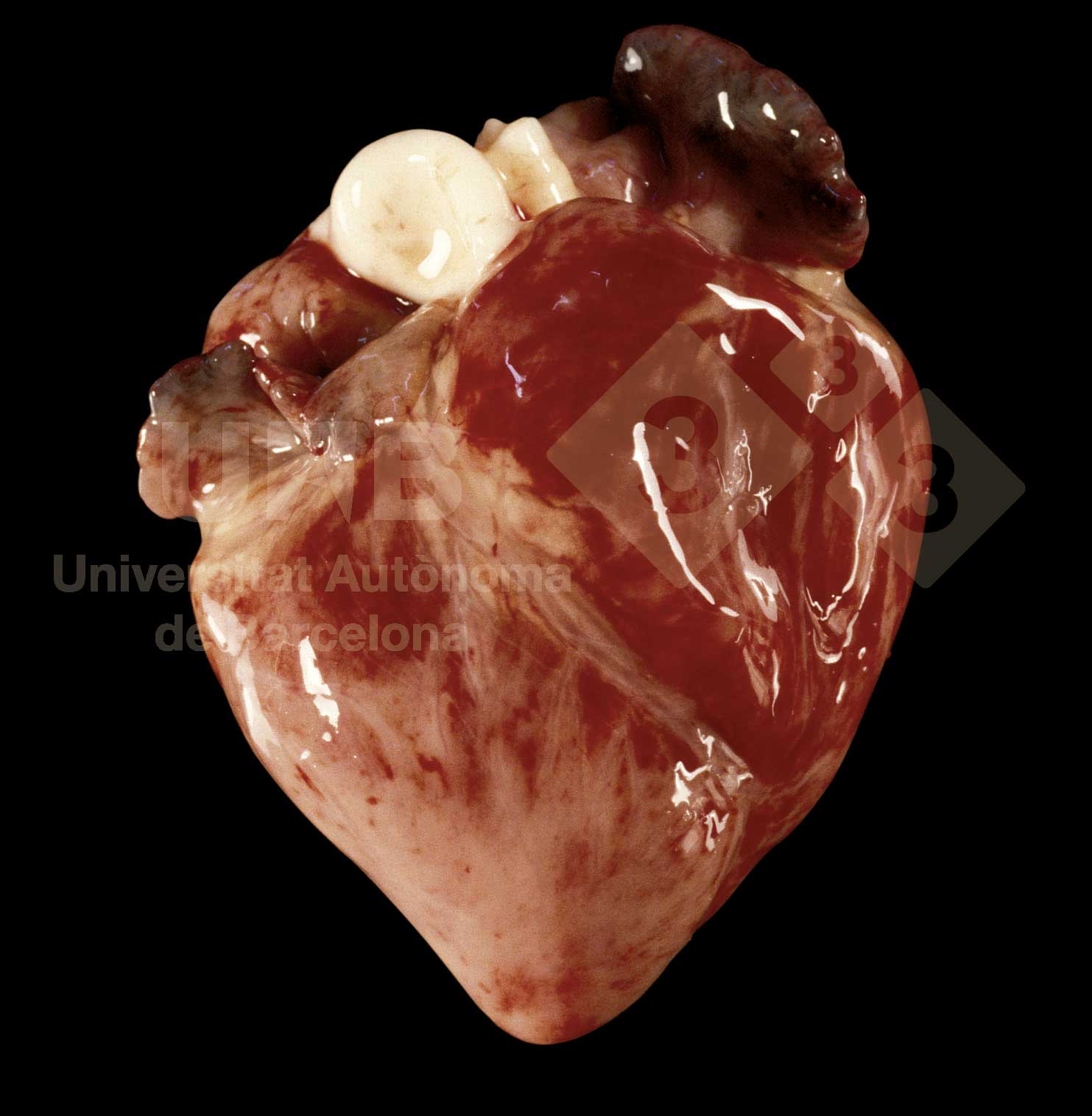 La pathologie du cœur mûriforme est causée par une carence en vitamine E et en sélénium. Cette carence endommage les vaisseaux sanguins du cœur. L'apparence macroscopique est une hémorragie. Le diagnostic différentiel comprend toute maladie provoquant une hémorragie (PPC, PPA ...), cependant, la lésion macroscopique est très évocatrice du cœur mûriforme et peu des autres maladies.