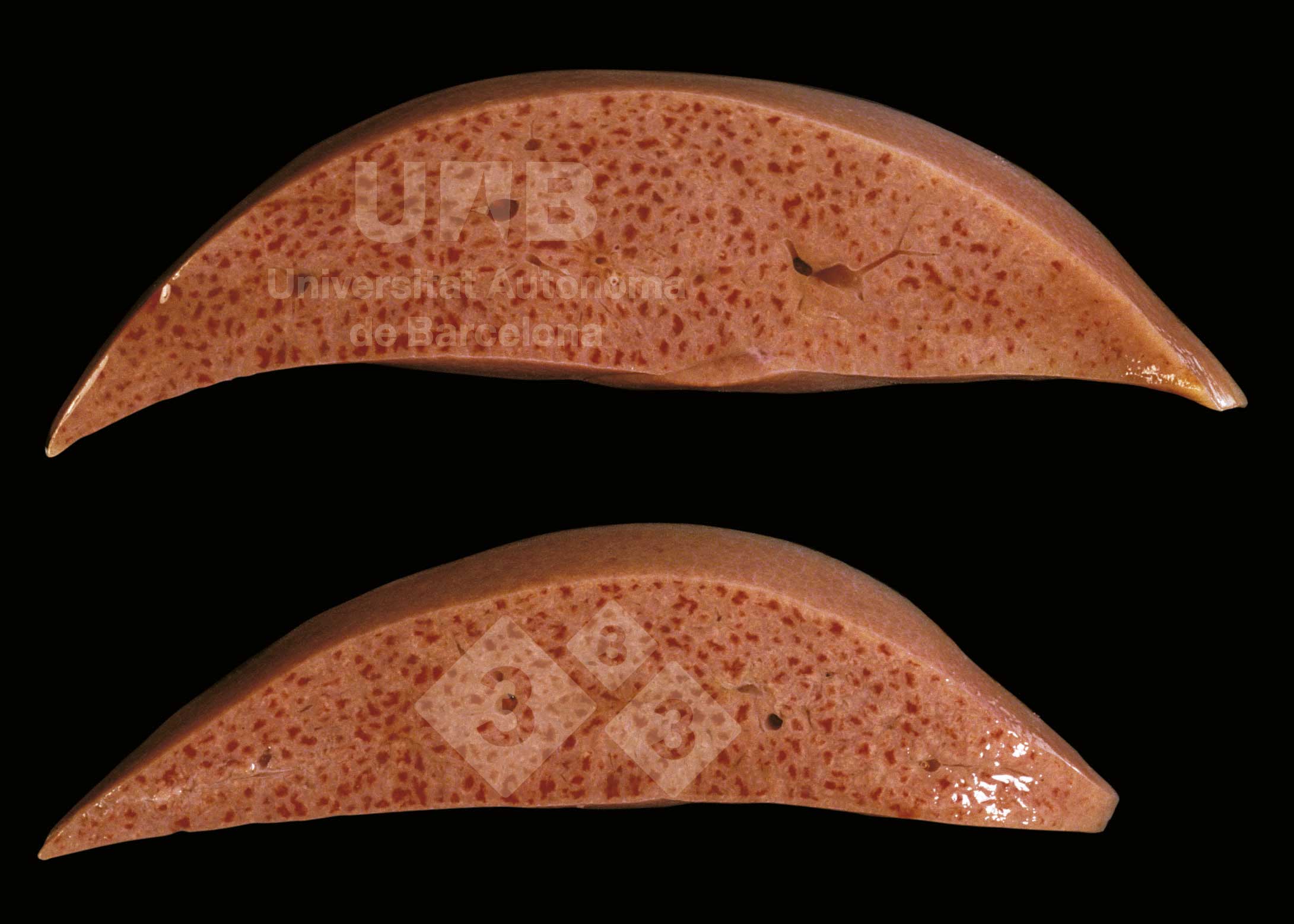 L’hépatose diététique chez les porcs est en lien avec la carence en vitamine et en sélénium. Elle produit de la nécrose et une congestion des zones centrilobulaires des lobes hépatiques (points rouges sur le foie de la photo) en donnant l’apparence macroscopique d’un réseau de points rouges.