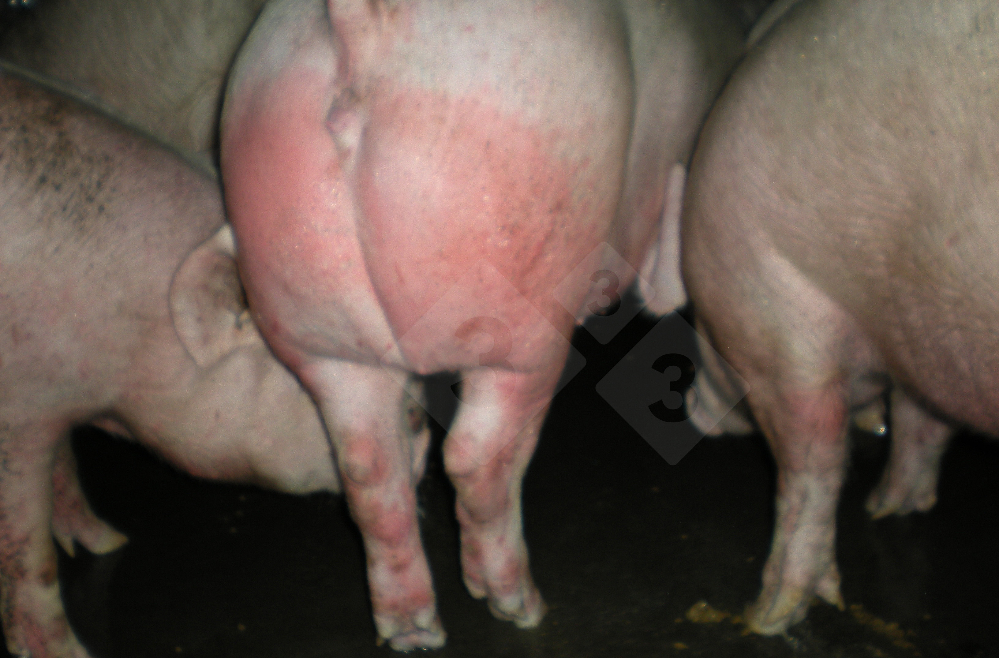 Ce porc a la peau ébouillantéé, ce qui arrive lorsque les animaux sont assis pendant de longues périodes sur des sols humides, mouillés avec de l'urine, ce qui est parfois appelé échaudage par l'urine. Une inspection détaillée montre que les lésions consistent en une éruption cutanée de couleur rouge clair à l'arrière des pattes postérieures. Cela peut être aggravé par des désinfectants irritants qui peuvent être mélangés avec de l'urine et de l'eau. Cet environnement humide et toute petite abrasion de la peau provoquent l'apparition de l'éruption congestive rougeâtre. Les situations dans lesquelles des porcs se sont vus obligés de s'asseoir sur un sol humide à cause de l'urine peuvent se produire dans les camions, les cases d'attente à l'abattoir ou dans des enclos avec des planchers en béton massif, mal drainés et où l'urine peut s'accumuler sur le sol sur lequel repose la truie. De nombreux désinfectants peuvent irriter la peau des porcs et il est donc important qu' après leur utilisation, on rince correctement. D'autres causes possibles de ces lésions comprennent l' allergie de contact avec des produits chimiques irritants.