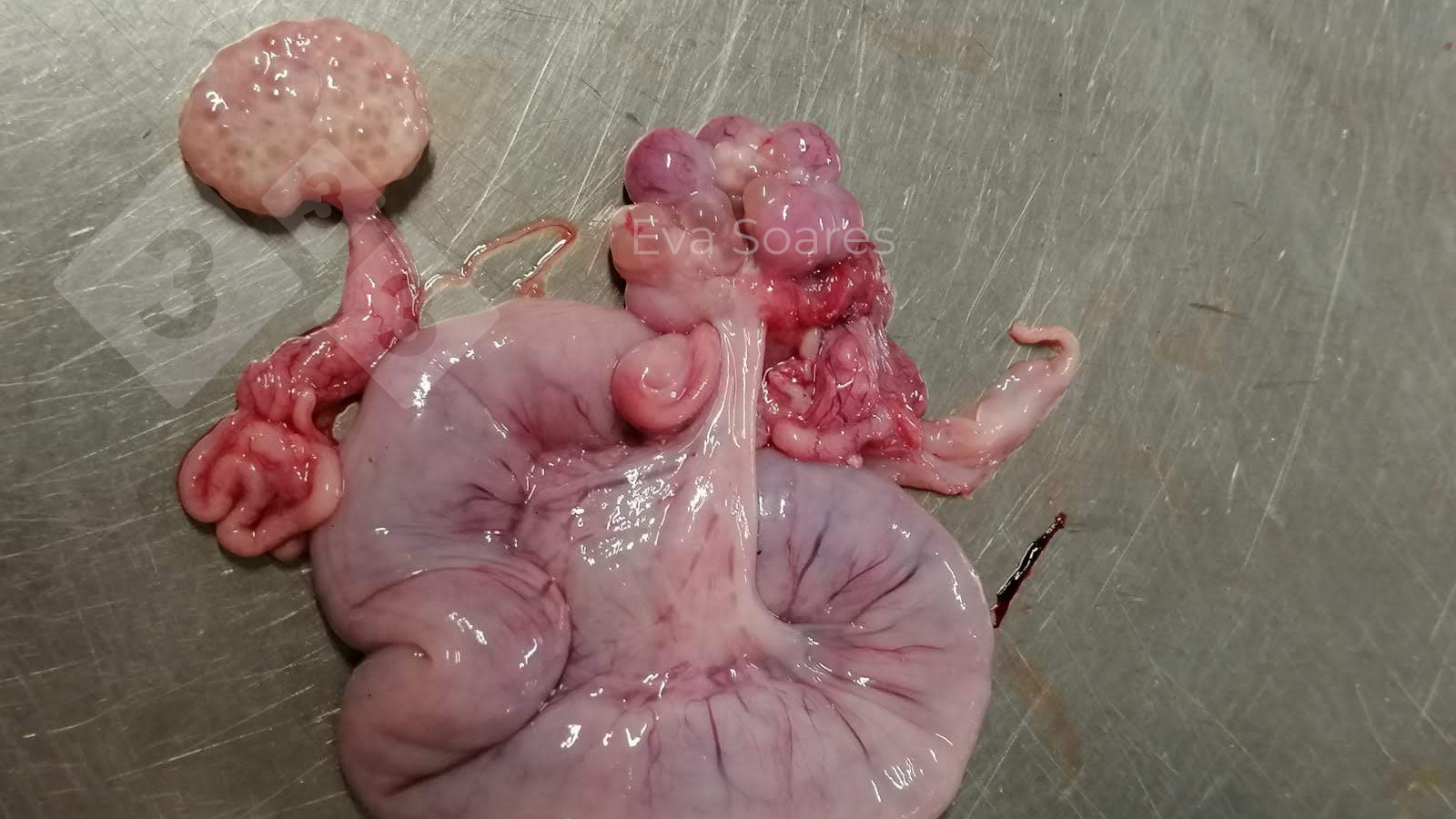 L'ovaire du côté gauche de l'image est normal, tandis que l'ovaire du côté droit présente une lésion compatible avec des kystes ovariens, anomalie ovarienne la plus fréquemment détectée en abattoir. Ce type de blessure peut être unilatéral ou bilatéral. Les kystes folliculaires peuvent être simples, généralement volumineux ou multiples. Les kystes peuvent aussi être lutéiniques, évoluant à partir des précédents et montrant une lutéinisation partielle de la structure folliculaire. Il existe une forme combinée appelée dégénérescence kystique des ovaires, associant la présence simultanée de kystes de tailles différentes qui, dans certaines publications, semblent constituer la forme prédominante de kystes ovariens chez le porc. Si les modifications kystiques dans les ovaires continuent, l'utérus montre souvent des signes d'hyperplasie progestative ou le clitoris s'agrandit.