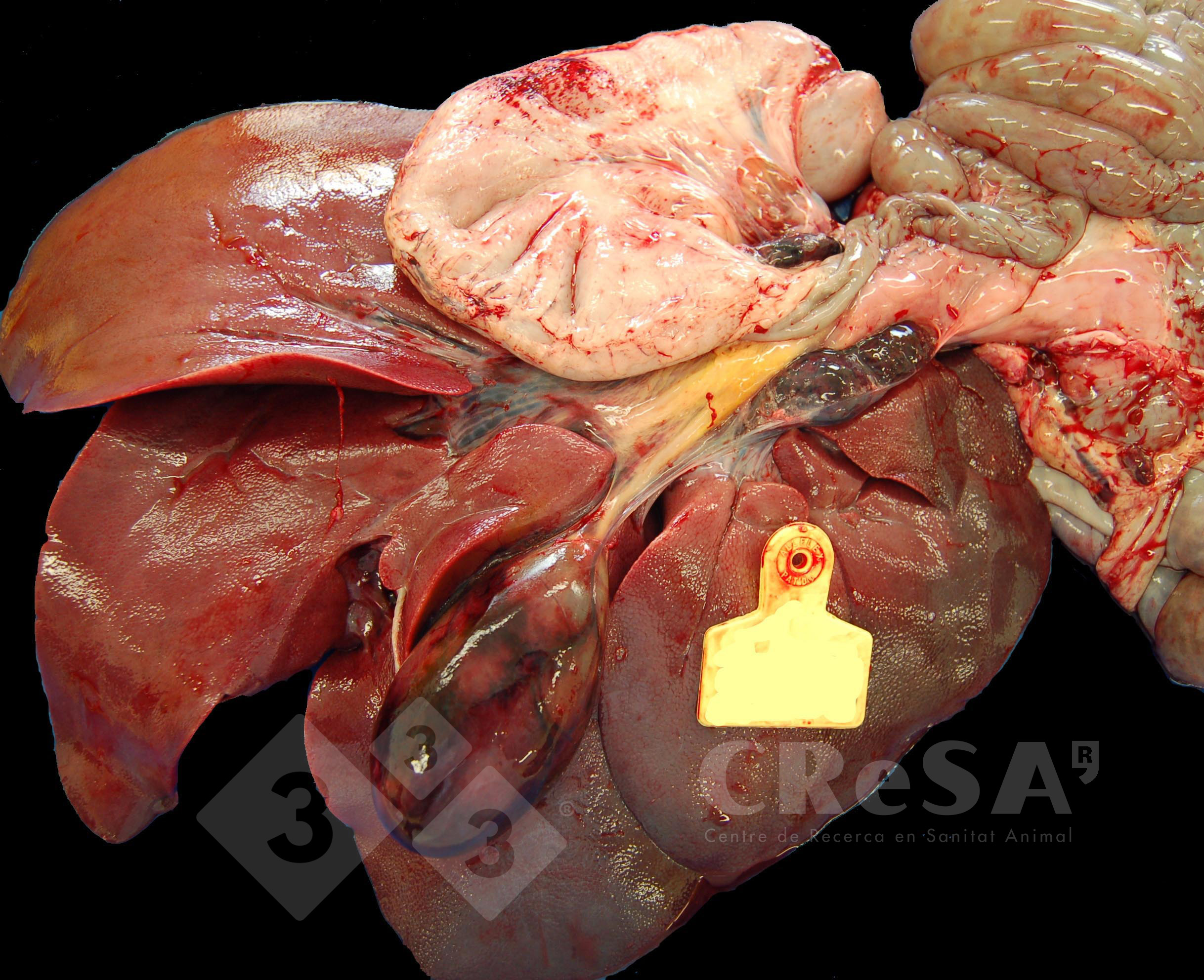 Le virus de la peste porcine africaine (PPA) provoque généralement des lésions hémorragiques sur les ganglions gastrohépatiques. Cette lésion est présente dans la majorité des cas après l'inoculation expérimentale avec des souches virulentes du virus de la PPA. Sur la photo, on a enlevé le péritoine pour montrer les ganglions hémorragiques.