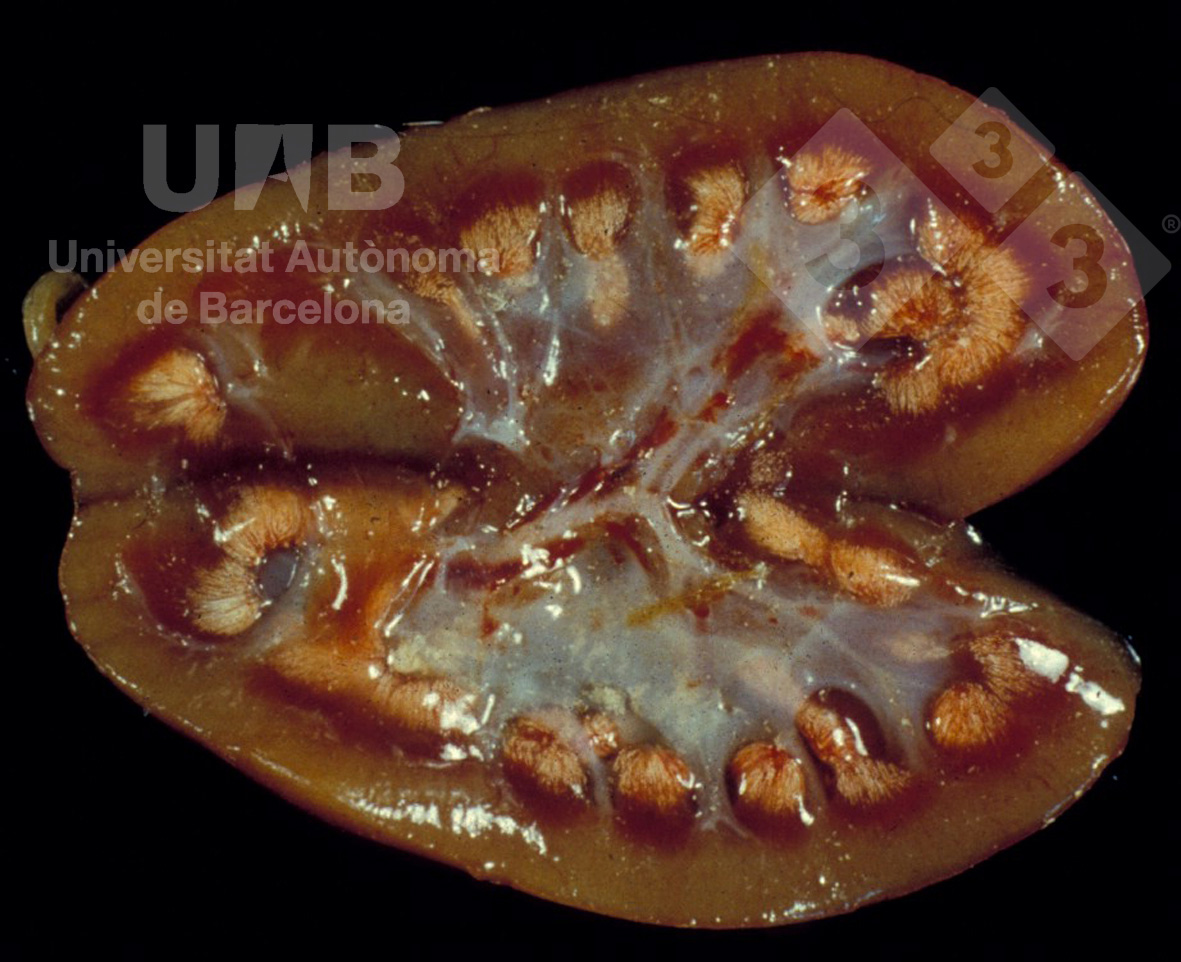 Les zones blanchâtres observées sur la papille rénale suggèrent une nécrose. Cette lésion est généralement associée à de l'hypoxie, de l’ischémie, de la déshydratation ou à des troubles toxiques.
