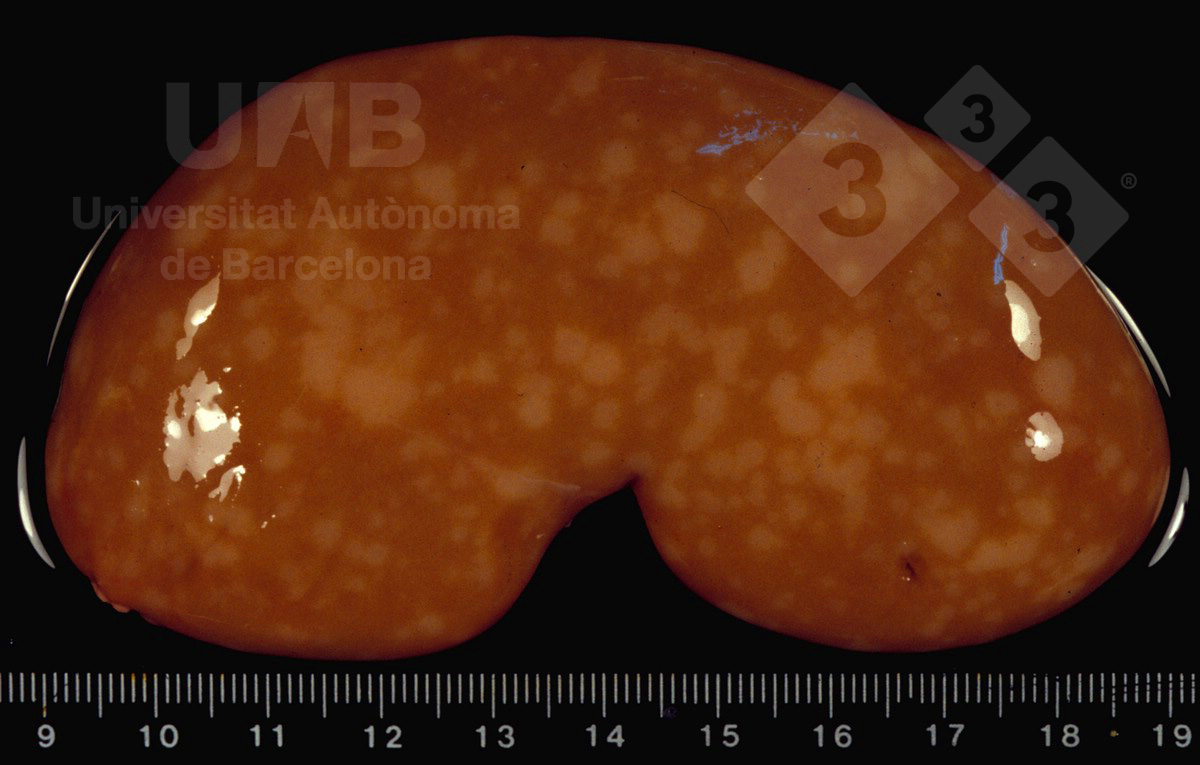 La néphrite interstitielle multifocale connue aussi sous le nom de "rein à tâches blanches" correspond à une inflammation chronique et non purulente du tissu interstitiel rénal. La cause est en général inconnue même si dans certains cas on l'a associé à une leptospirose et au PCV2.
