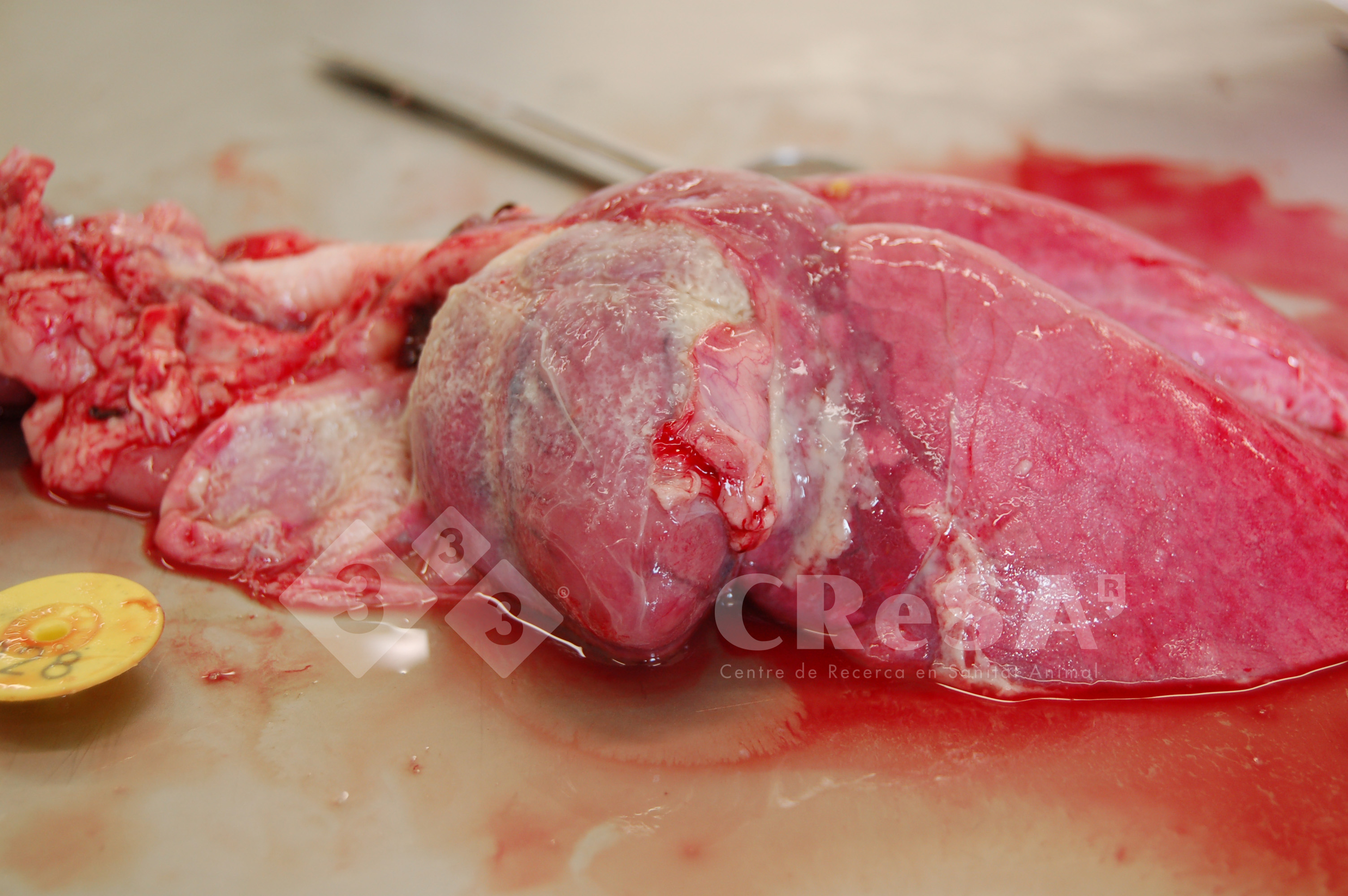 Il s'agit d'une péricardite fibrineuse sur un porc atteint de maladie de Glässer causé par la bactérie Gram négative Glaesserella parasuis. Elle provoque normalement de la polysérosite, une méningoencéphalite et de la polyarthrite. Le fibrinogène est libéré du flux sanguin à cause des dommages vasculaires. Le diagnostic différentiel doit aussi inclure Mycoplasma hyorrhinis.