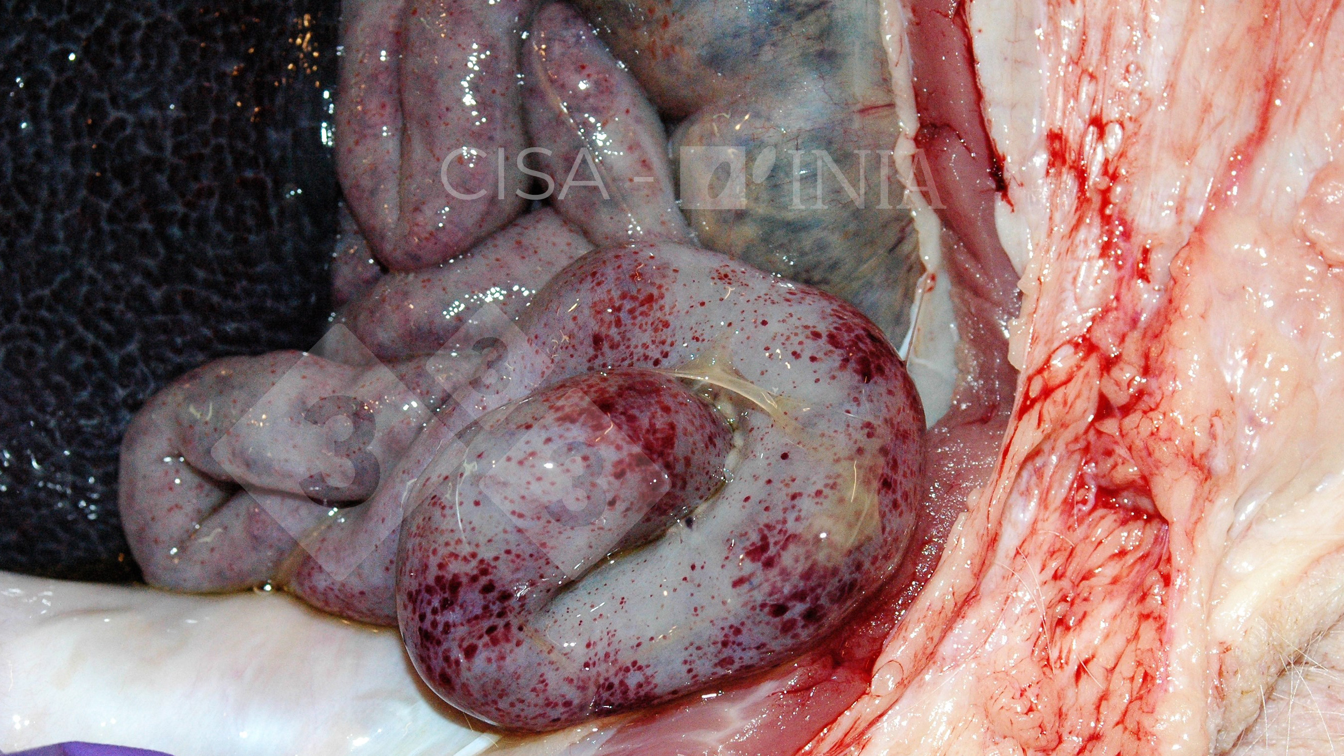 Intestin grêle avec hémorragies pétéchiales dans la séreuse et la muqueuse. Il s'agit d'un cas aigu de peste porcine africaine observé 2 jours après l'infection expérimentale. L'animal a présenté une forte fièvre (> 41 ° C), de l'anorexie et de la prostration.