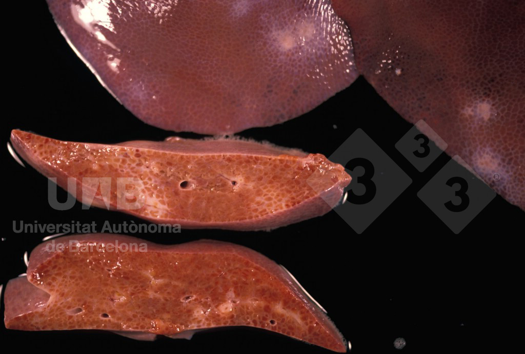 Ces lésions sont dues à la migration des larves d' Ascaris suum à travers le parenchyme hépatique. Cette migration crée une inflammation interstitielle qui est remplacée par du tissu fibreux dans les phases chroniques. L'observation macroscopique montre des zones blanchâtres multifocales , généralement appelées «taches de lait».