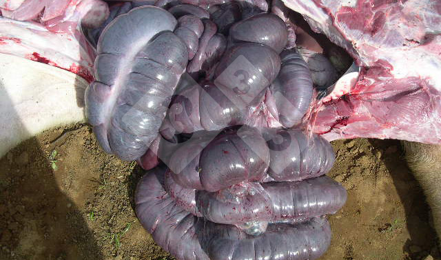 Il s’agit d’une torsion intestinale sur un porc charcutier. Normalement, les porchers signalent que ces porcs ont une mort subite. L'autopsie des porcs atteints montre animaux pâles et avec un abdomen très gonflé. En ouvrant l'abdomen avec soin, on observe de nombreuses anses de l'intestin distendues et gonflées contenant du gaz et du liquide sanguinolent. Ces anses intestinales peuvent avoir des couleurs vives, allant du violet au vert. Pendant l'autopsie, on doit chercher sous les anses à la base du mésentère intestinal et la colonne vertébrale, pour palper qui sont tordus en un nœud serré. L'intestin grêle du porc est assez long et est suspendu au plafond de l'abdomen lorsque l'animal est debout. Chez un porc actif, cela signifie que les torsions peuvent être communes, ce qui peut entraîner cet accident extrême de l'intestin cette fin, entraînant une mort rapide de l'animal. Habituellement, cela se voit chez des porcs charcutiers actifs, lors d’un excès d'activité, se terminant avec des combats et une consommation excessive. D’autres pathologies d’aspect similaire comprennent l'autolyse, l’entéropathie proliférative ou la colibacillose.