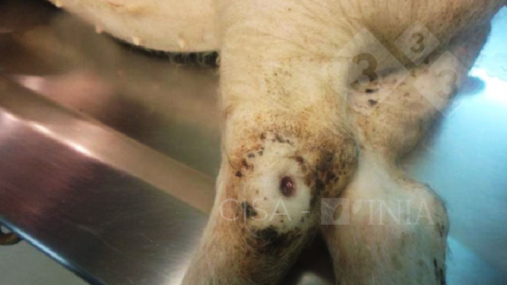 Peste porcine africaine chronique, 45 jours après une infection expérimentale. L'animal a présenté une perte de poids, une fièvre discontinue, une difficulté respiratoire, des ulcères cutanés et de l'arthrite pendant un mois.