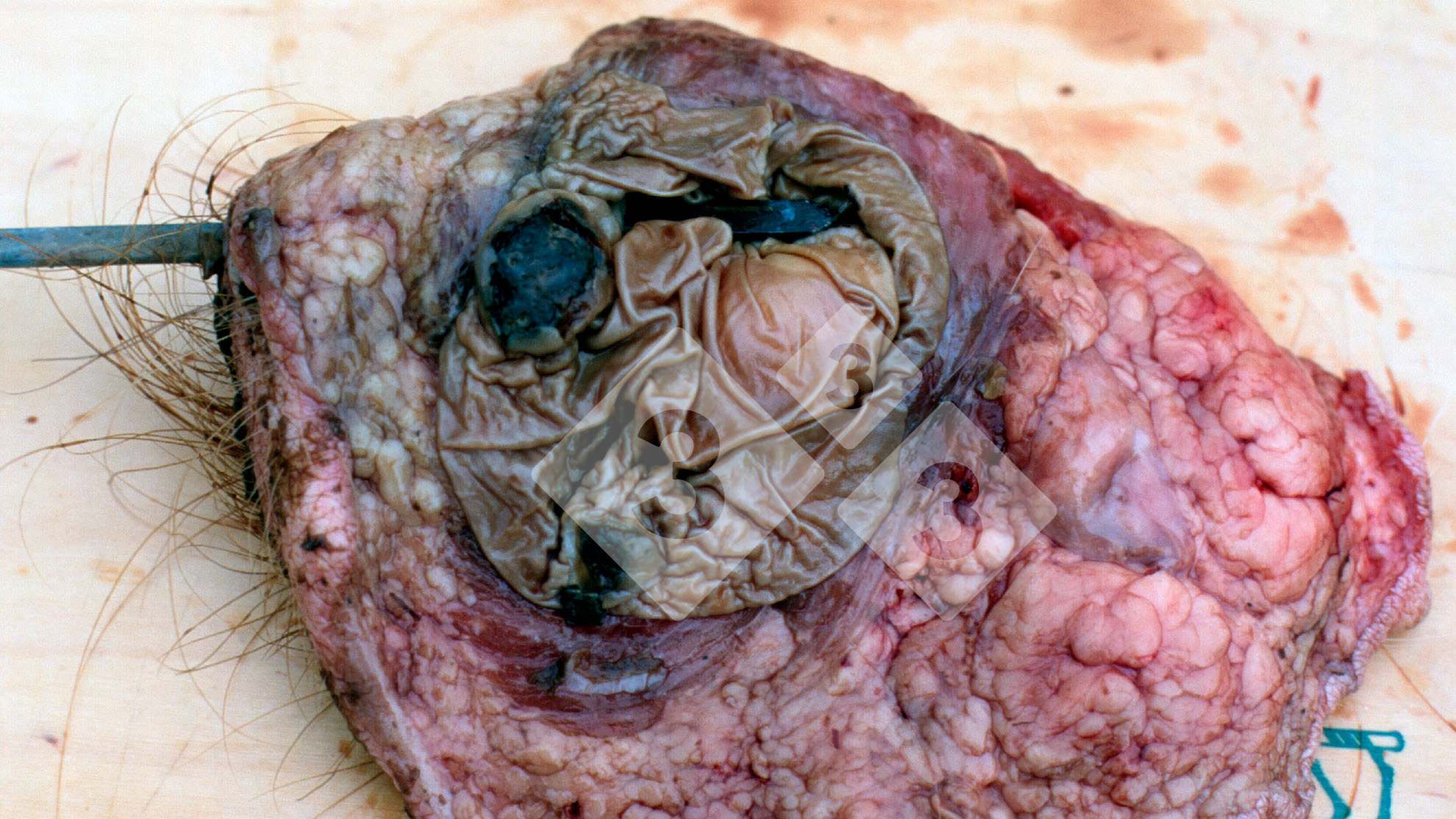 Ces lésions ne sont pas fréquentes chez les verrats adultes et peuvent être palpées à travers l'orifice préputial avec un petit doigt (avec le mâle bien immobilisé). Une petite partie des lésions produira une hémorragie sporadique ou, comme dans ce cas, persistante. Bien qu'il ait été suggéré que Chlamydophila et Brucella suis puissent être la cause de ces ulcères, ce n'est pas tout à fait clair et la plupart de ces lésions sont probablement le résultat d'un mélange d'infections non spécifiques dans le diverticule préputial. Les ulcères préputiaux associés à PPA / PPC ne sont pas bien connus, mais en théorie, ils pourraient se produire si d'autres lésions hémorragiques sont observées. (Macroscopiquement, cette lésion ressemble à un ulcère en bouton de la muqueuse du colon). L'instillation locale d'antibiotiques à large spectre (tels que les préparations intramammaires qui sont utilisées en dehors de cette indication) et l'élimination régulière du liquide accumulé devraient être capables de guérir la lésion, mais les cas graves ou persistants répondent mal au traitement. L'ablation chirurgicale avec anesthésie a été suggérée, mais elle a une justification économique douteuse. La présence de sang dans le sperme n'est pas nécessairement spermicide, mais le changement de couleur le rendrait inacceptable pour la vente.