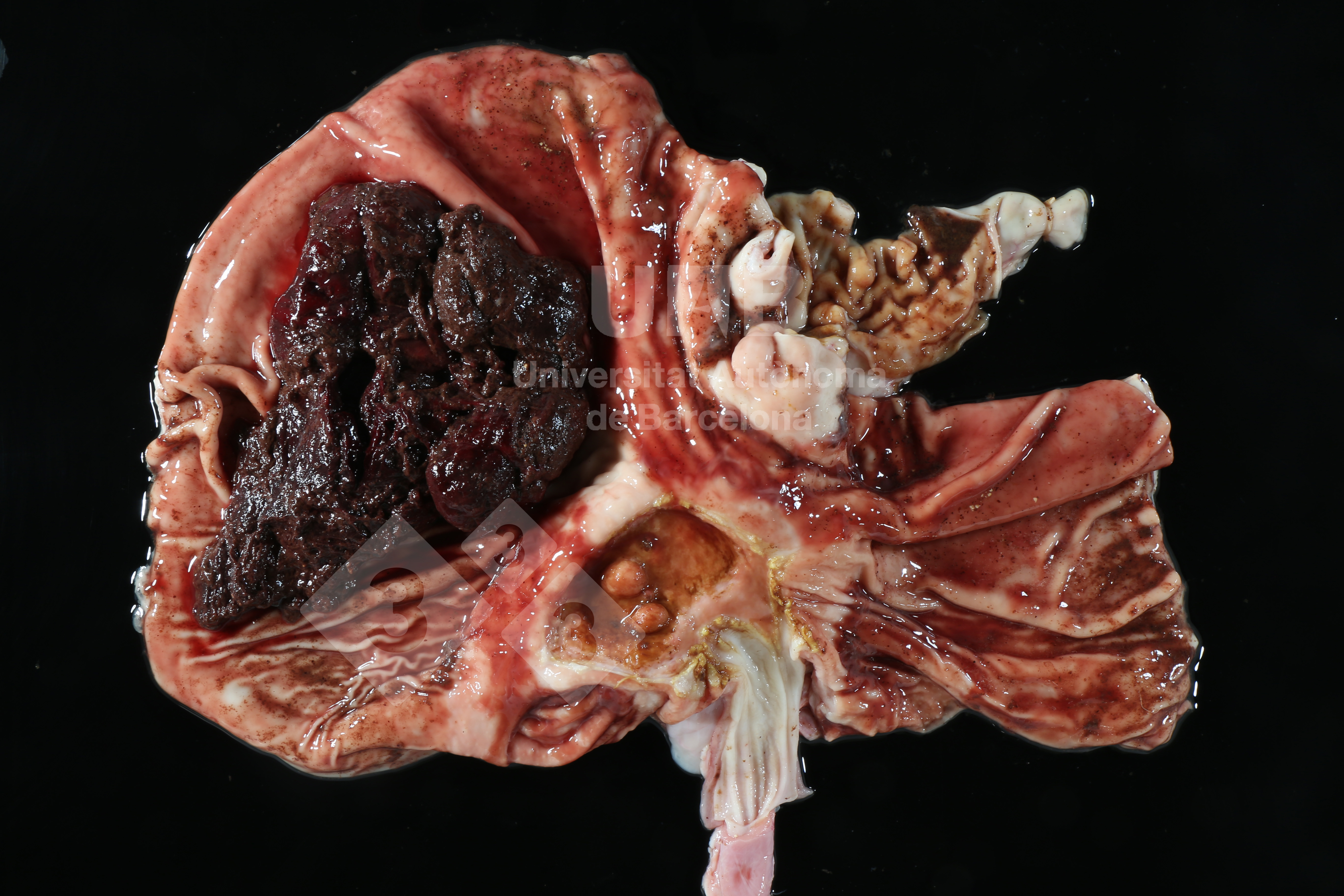 Ce porc souffrait de graves ulcère gastrique chronique de la "pars oesophagea" (voir le cardia). Cette ulcération produit souvent des saignements intermittents qui, parfois, peuvent être aussi aigus et graves qu’ils provoquent un choc hypovolémique et une mort subite. A l'autopsie, l'ulcère gastrique peut être vu avec un contenu sanguinolent ou des caillots (comme ici) dans la lumière.