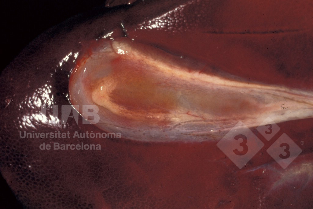 Il s'agit d'un œdème de la paroi de la vésicule biliaire. Il est en général causé par la maladie de l'œdème (colibacillose entérotoxèmique) mais on peut inclure dan le diagnostic différentiel d'autres maladies comme l'hépatose diététique.