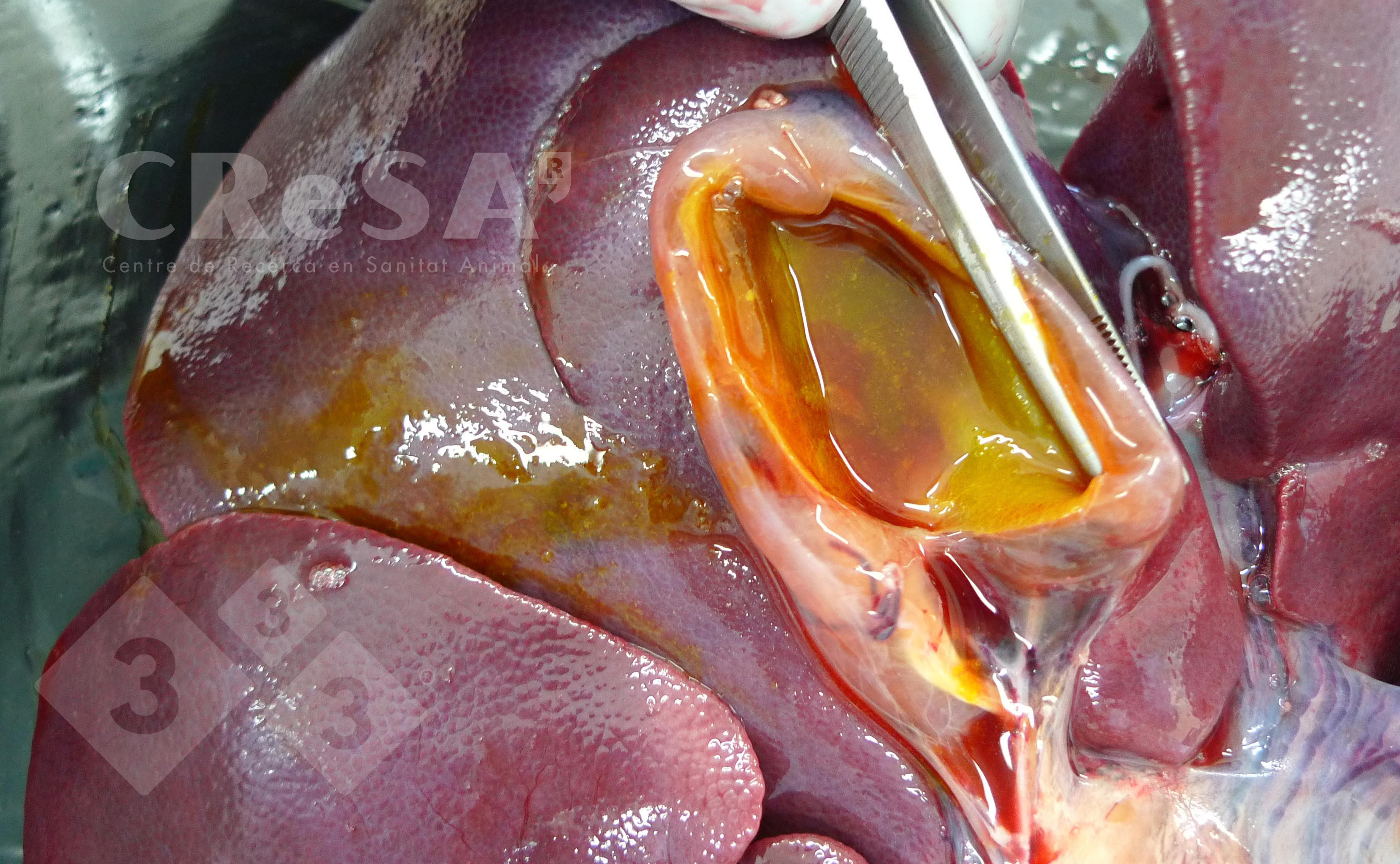 Le virus de la peste porcine africaine (PPA) peut produire un œdème de la paroi de la vésicule biliaire comme on peut le voir sur cette photo. Cependant, il s'agit d'une modification relativement non spécifique qui peut être observée dans beaucoup de processus pathologiques en incluant la maladie de l'œdème, l'hépatose diététique, la toxicose,etc.