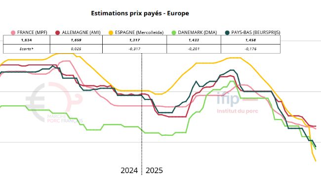 Le marché porcin européen reste sous pression : stabilité en France, baisse en Allemagne, Espagne et Belgique, tandis que la Chine se stabilise.