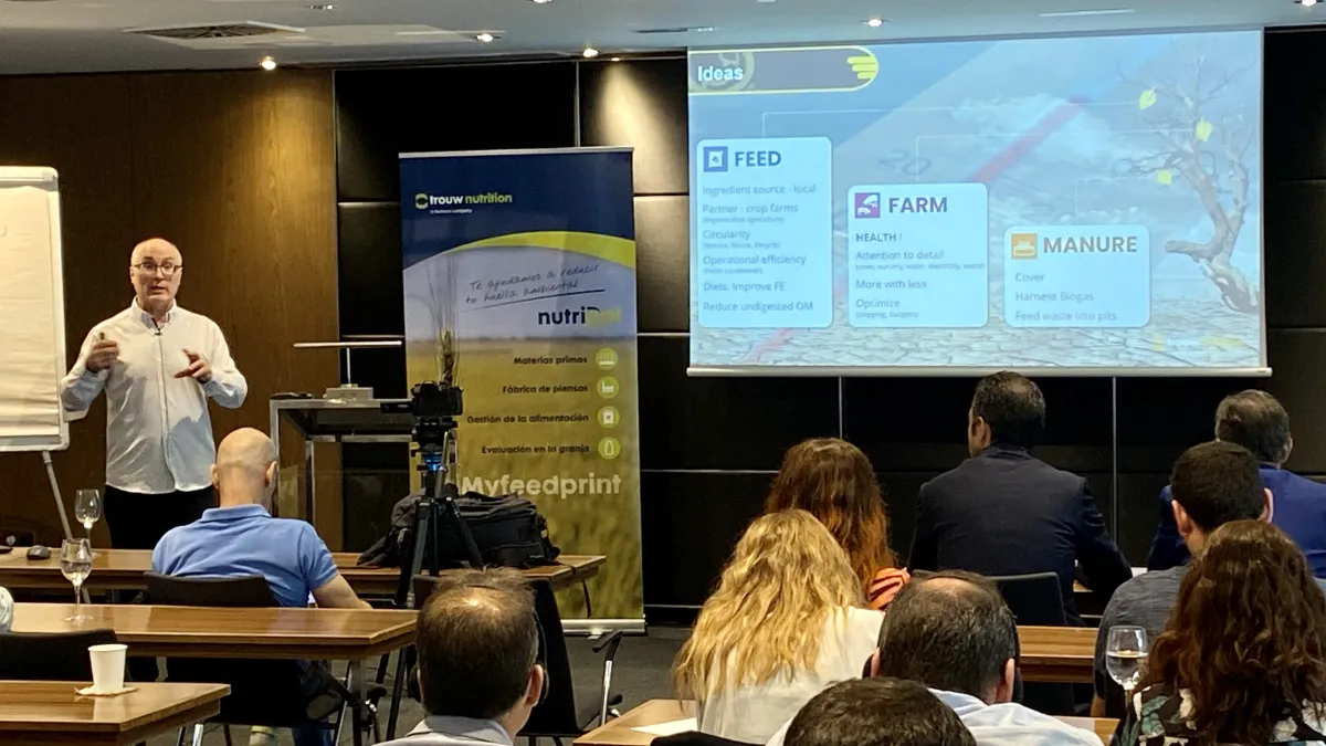 ‘Anything that you can do to improve feed efficiency will occur in a reduction of emissions at farm level’, Neil Ferguson at the meeting “Sustainability in Swine Production” organised by Trouw Nutrition in Madrid, Spain.