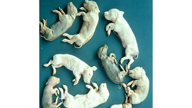 L’élevage est contaminé par le SDRP depuis au moins 1996. Depuis cette date, le troupeau de naissage n’a jamais présenté de signes pathologiques « explosifs » attribuables au virus mais connaît des « vagues » de mise-bas précoces, mortinatalité, momifications, mortalités pré-sevrage.
